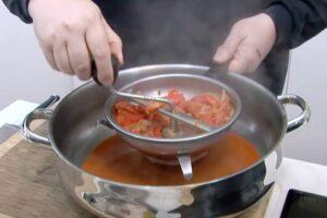 Cocinar las verduras y triturarlasCuando el pimiento rojo comience a ponerse blando, añadimos el tomate cortado en gajos y le damos un golpe de pimentón. El tipo y la cantidad lo dejo a vuestro gusto. Ponemos un poco del caldo de pescado para que cuezan las verduras y cuando estén blandos el tomate y el pimiento, trituramos todo con el pasapuré o la batidora.