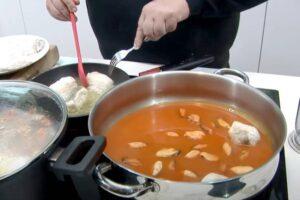 Freír la merluza y el rapeEn la cazuela en la que haremos el guiso final de la zarzuela, ponemos la salsa y añadimos 6 cazos de caldo de pescado colados. Ahora tenemos que freír un poco el pescado enharinado y cuando lo hayamos hecho lo vamos poniendo en la cazuela con la salsa, en la que habremos puesto ya los mejillones también. En el momento que se dore la harina lo quitáis, terminará de hacerse con la salsa.